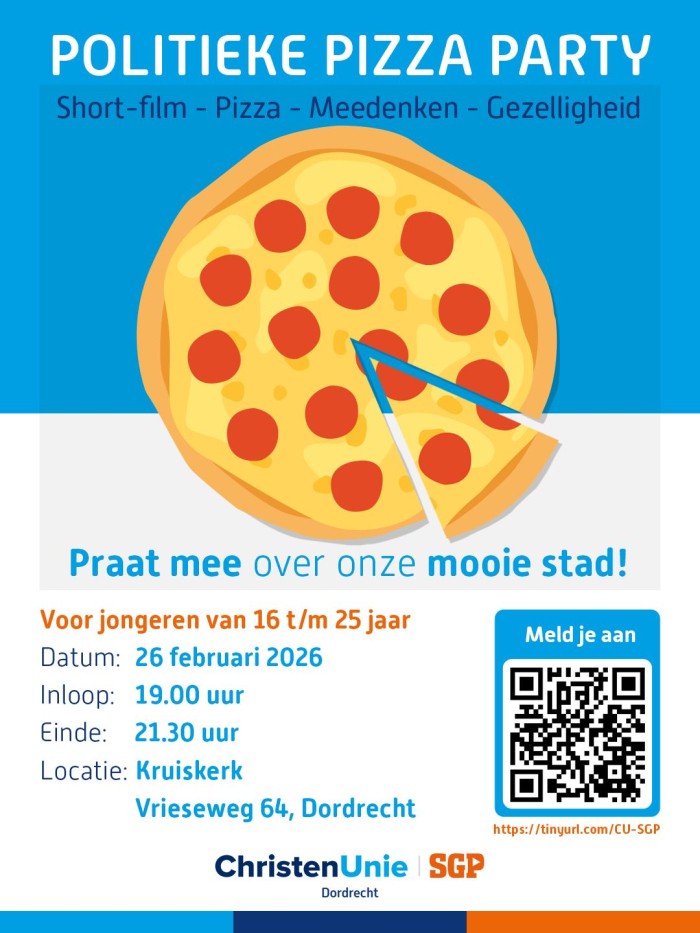 Op 26 februari organiseert de ChristenUnie-SGP Dordrecht een Politieke Pizza Party, speciaal voor christelijke jongeren tussen de 16 en 25 jaar. Een politieke jongerenavond vol gezelligheid én met het doel om met jongeren in gesprek te gaan over Dordrecht.